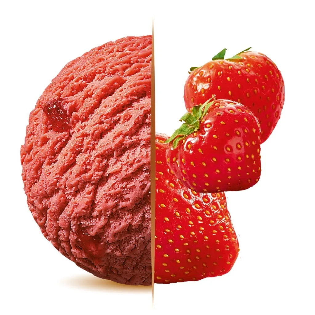 Gelado de morango com deliciosos pedaços.
