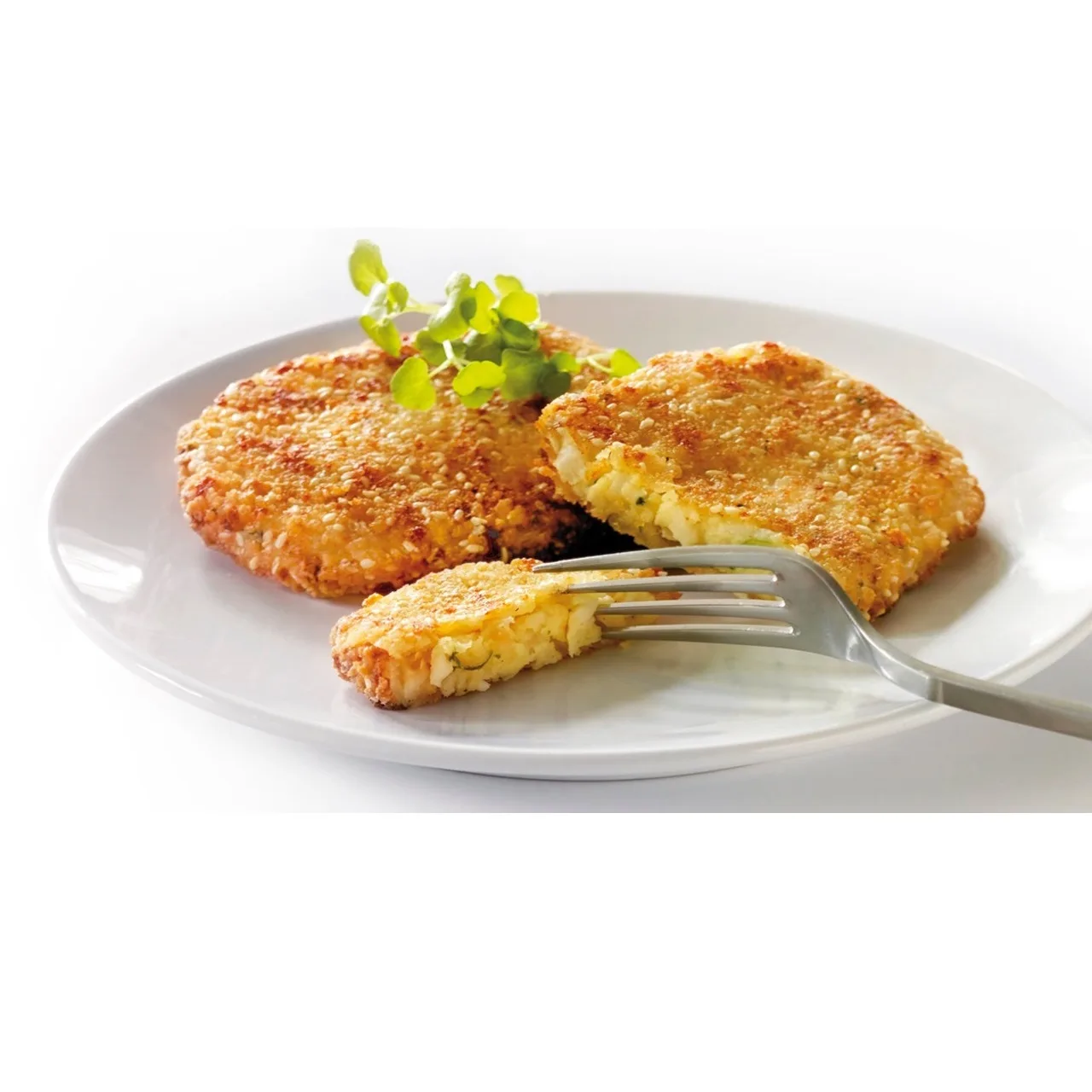 Uma mistura de pequenos floretes de couve-flor com alho-porro e queijo envoltos numa crosta crocante coberta com sementes de sésamo dando ao hambúrguer aquele toque especial.