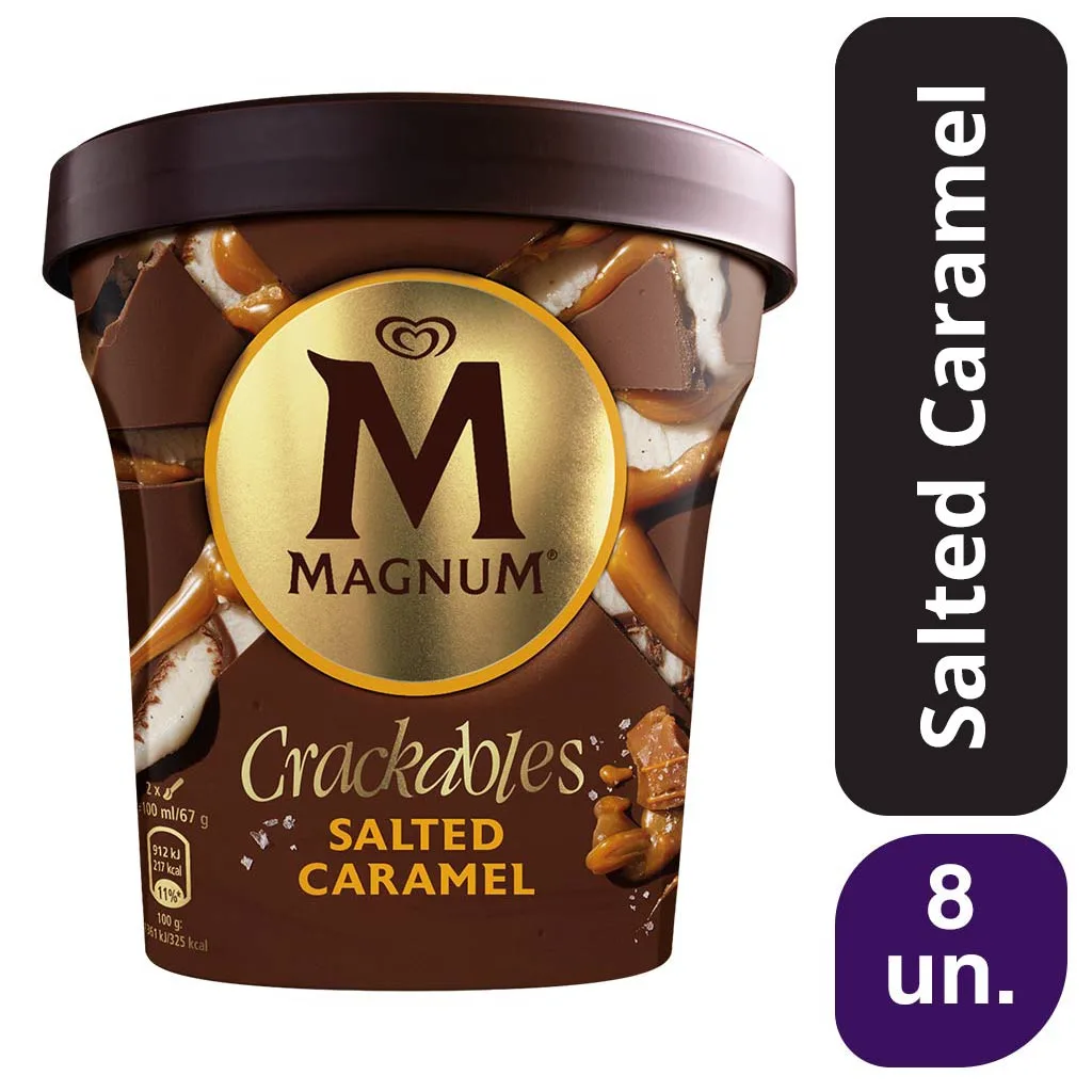 Glace à la vanille avec une riche sauce au caramel salé et des pépites de chocolat, enveloppée d'une épaisse couche croquante de chocolat au lait Magnum.