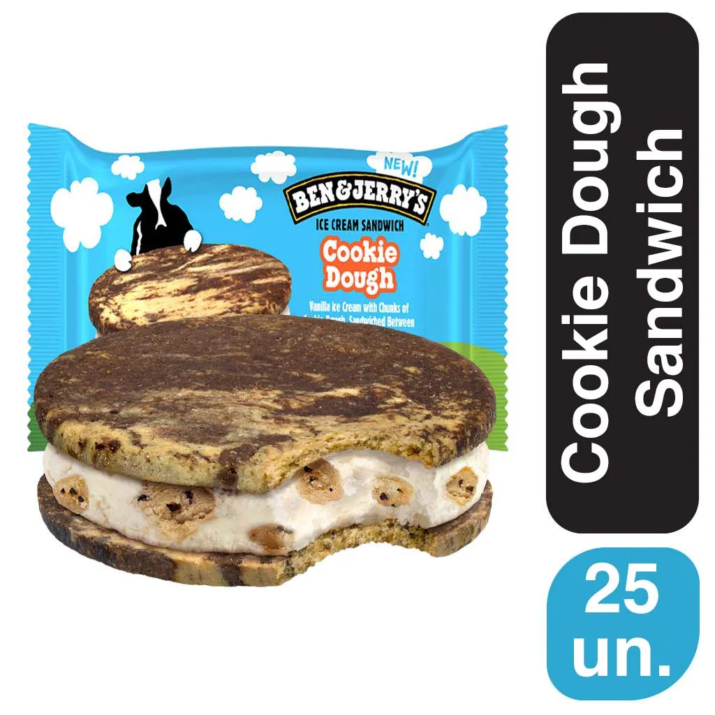 A sanduíche é composta por dois generosos biscoitos de baunilha e cacau, ambos feitos com manteiga de verdade, por dentro, você encontrará um gelado cremoso, generosamente recheado com pedaços de massa de biscoito, uma experiência com pedaços generosos e a assinatura inconfundível da Ben & Jerry’s.