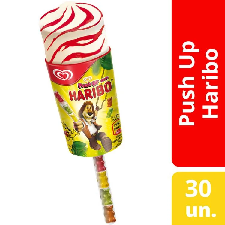 Gelado aromatizado de baunilha com xarope de morango e gomas aromatizadas com fruta.